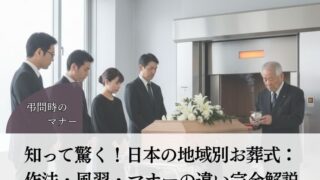 日本の地域別お葬式:作法・風習・マナーの違い完全解説日本の仏式葬儀は、一見すると全国どこでも同じように見えますが、実は地域によって驚くほど独自の風習や作法が存在します。昔ながらの慣習が深く根付いている地域では、その地域のルールを知らずに参列...