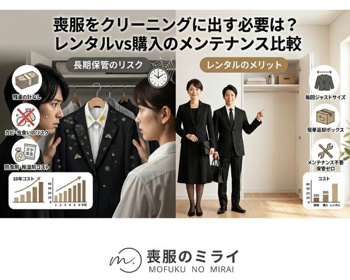 喪服の購入は「一度買えば何度でも使える」という点で一見お得に思えますが、実際にはクリーニング代、保管用品代、保管スペース、そして体型変化による買い替えリスクまで含めると、想像以上のコストがかかります。