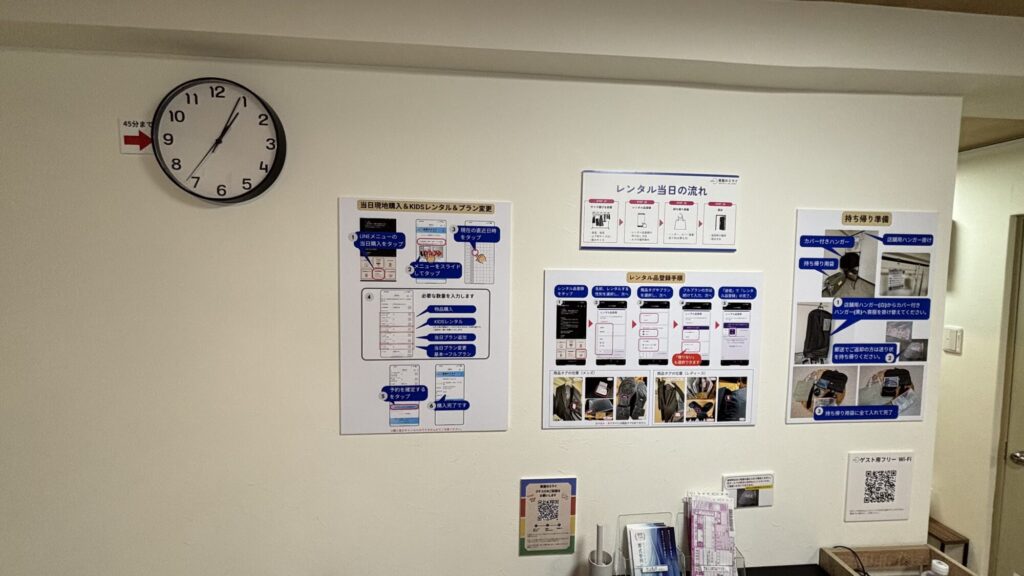 レンタル当日に「対応いただきたい内容」と「追加購入等」の案内パネルをご用意させていただきました。