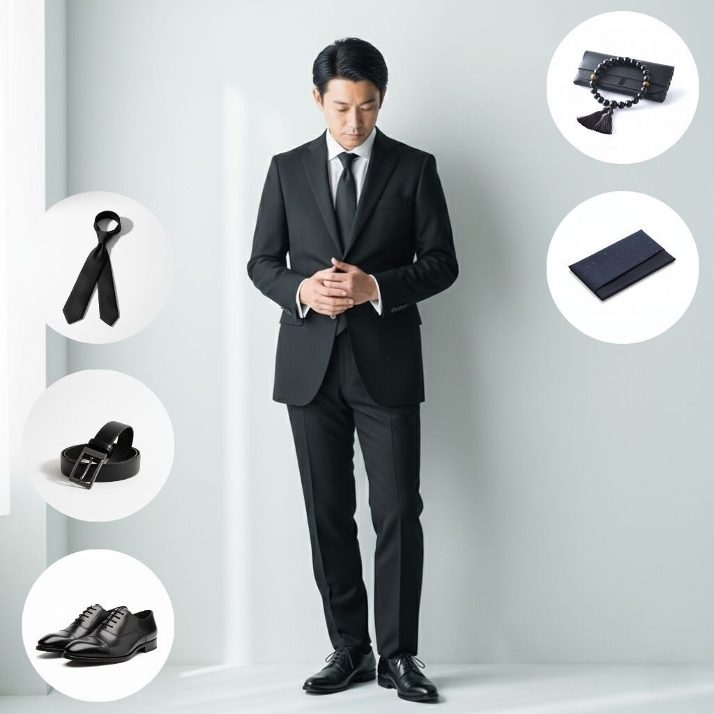 メンズフルプランは、喪服+ネクタイ+ベルト+シューズ+念珠+袱紗のセットです。6泊7日¥9,800(税込)