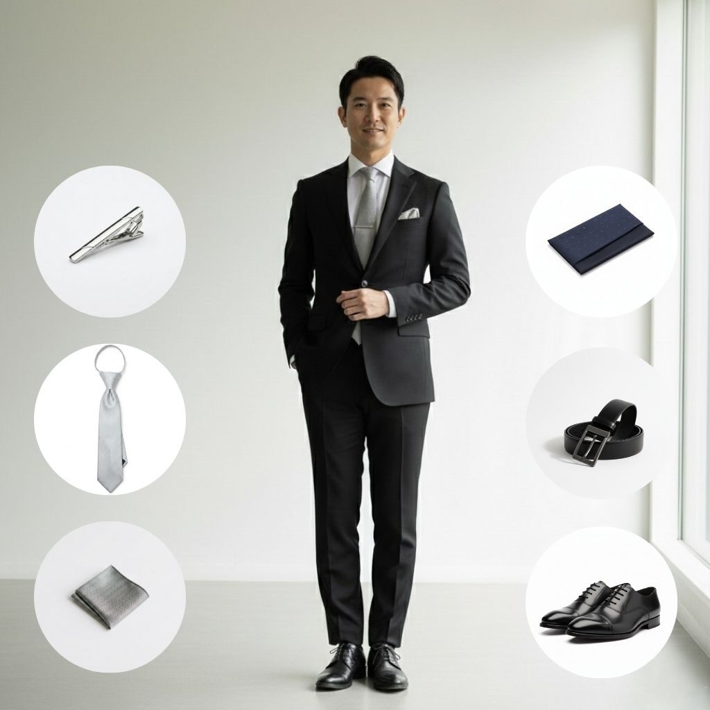【メンズフルプラン】は、礼服+シルバーネクタイ+ネクタイピン+ポケットチーフ+ベルト+シューズ+袱紗のセットです。6泊7日¥9,800(税込)