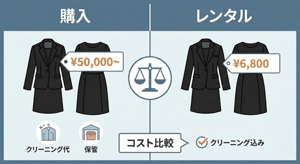 (初期費用5万円 + クリーニング3回 1万円 + 10年後の買い直しリスク) - レンタル派(喪服のミライ):約20,400円〜